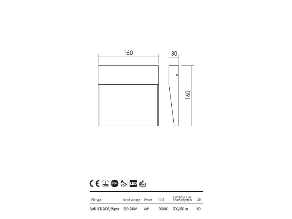 Vonkajšie nástenné svietidlo vybavené SMD LED diódami, telo z tlakovo liateho hliníka elektrostaticky lakované matnou bielou alebo antracitovou farbou, číry polykarbonátový difúzor.
