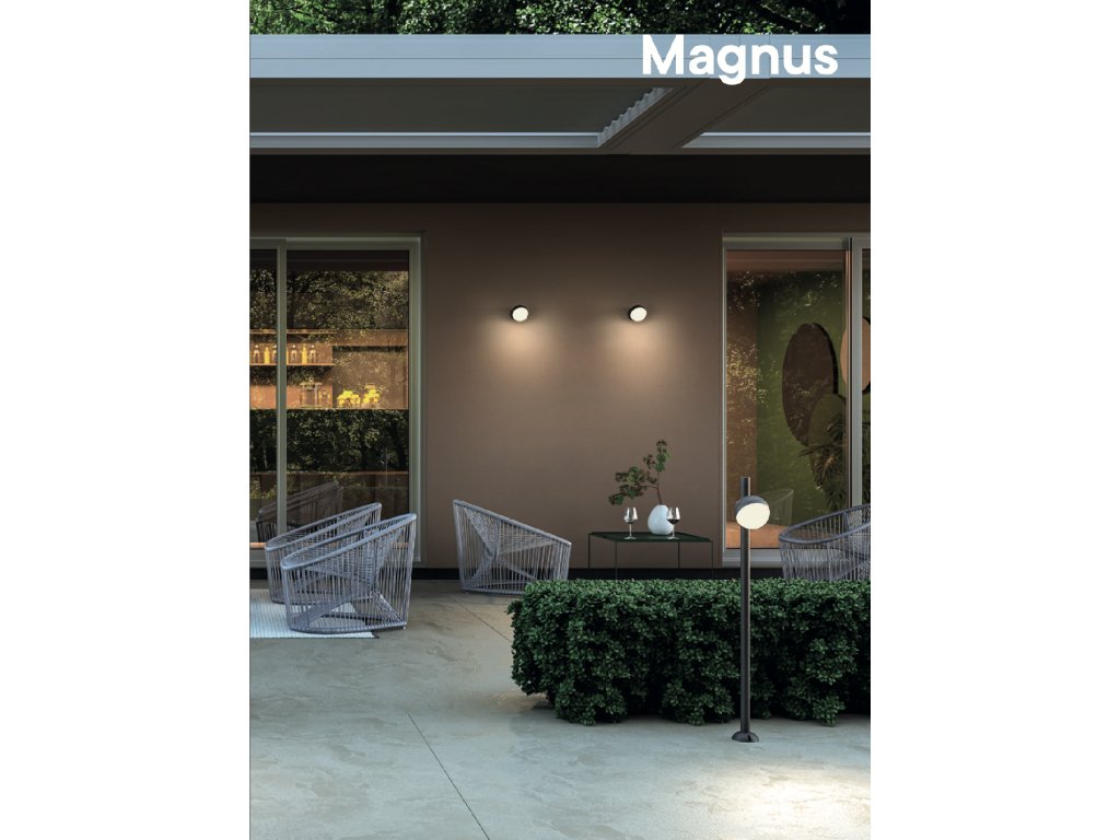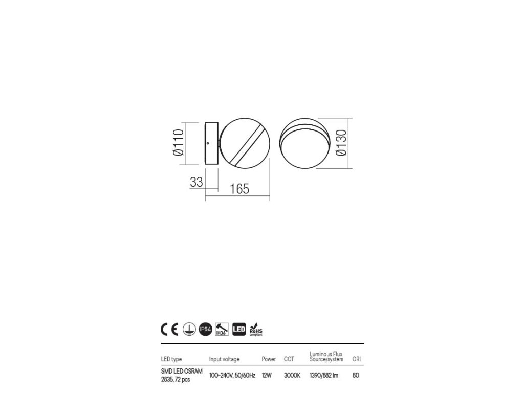 Vonkajšie nástenné svietidlo vybavené SMD LED diódami, telo z tlakovo liateho hliníka elektrostaticky lakované tmavo šedou alebo hnedou farbou, dvojitý opálový polykarbonátový difúzor vo vnútri a priehľadný zvonku.