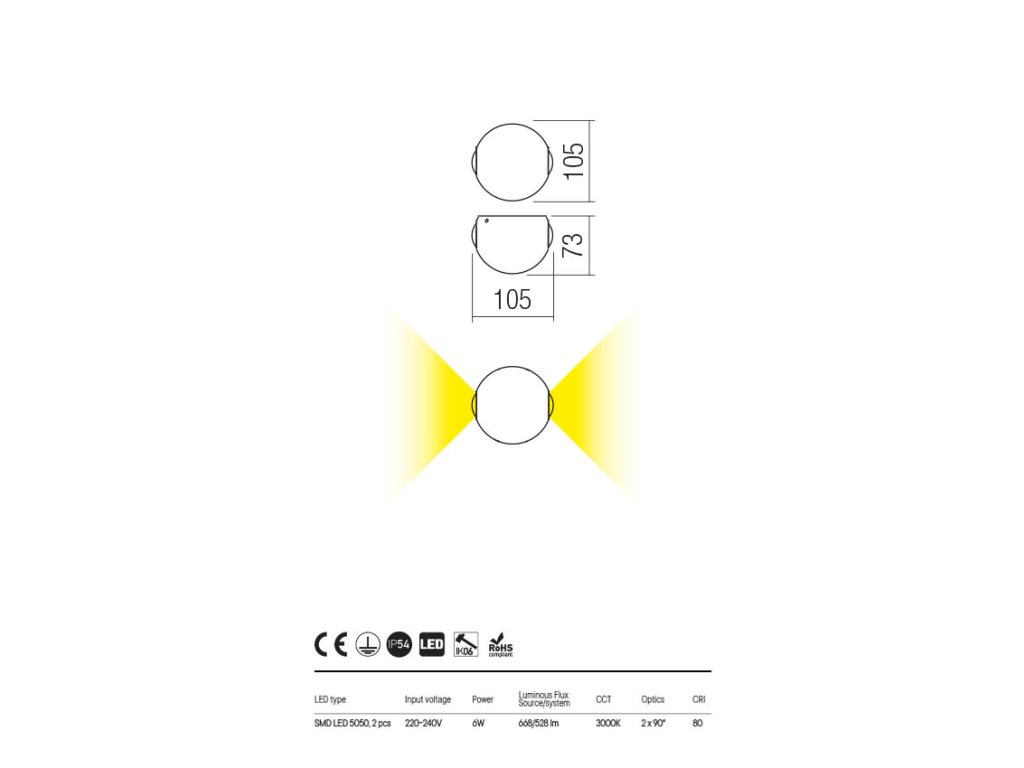 Vonkajšie nástenné svietidlo vybavené LED diódami SMD, telo z tlakovo liateho hliníka elektrostaticky lakované matnou bielou alebo antracitovou farbou. Vybavené 2 šošovkami vyžarujúcimi 2 svetelné lúče pod uhlom 90°. Integrovaný ovládač.