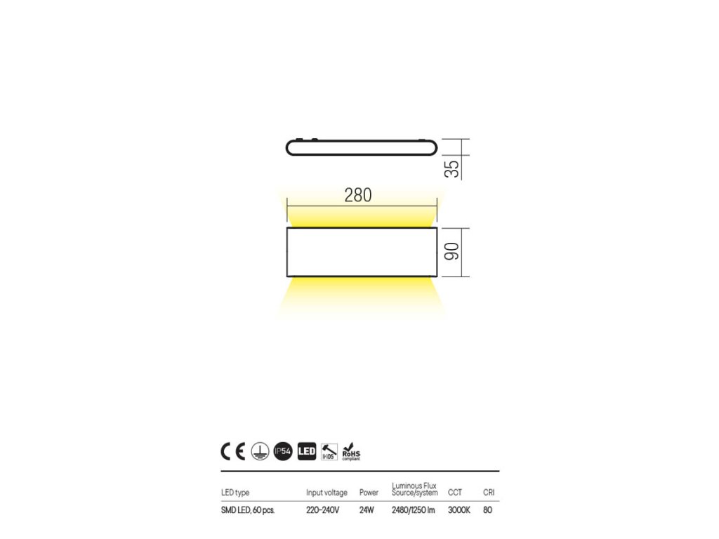 Vonkajšie nástenné svietidlo vyrobené z hliníkovej zliatiny so saténovým polykarbonátovým difúzorom.