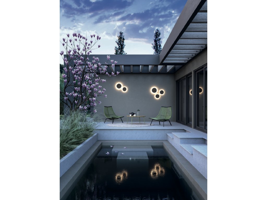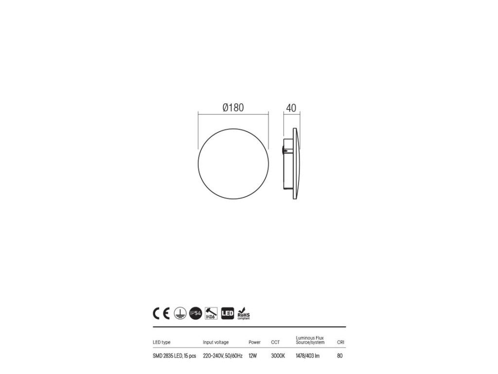 Vonkajšie nástenné svietidlo s nepriamym rozptylom svetla vybavené LED diódami SMD. Telo z tlakovo liateho hliníka elektrostaticky lakované matnou bielou, antracitovou alebo hnedou arvou, saténový polykarbonátový difúzor.