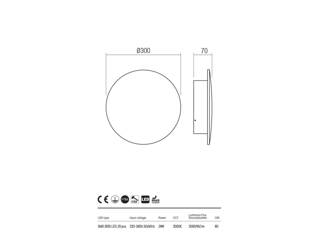 Vonkajšie nástenné svietidlo s nepriamym rozptylom svetla vybavené LED diódami SMD. Telo z tlakovo liateho hliníka elektrostaticky lakované matnou bielou, antracitovou alebo hnedou arvou, saténový polykarbonátový difúzor.
