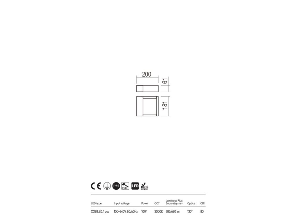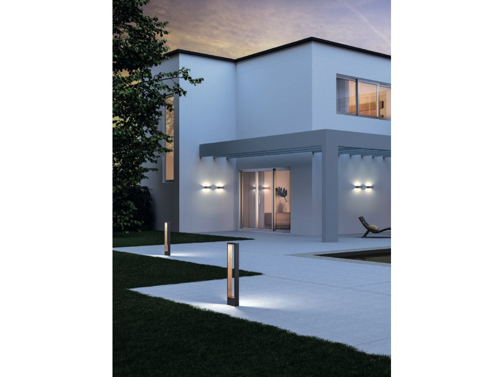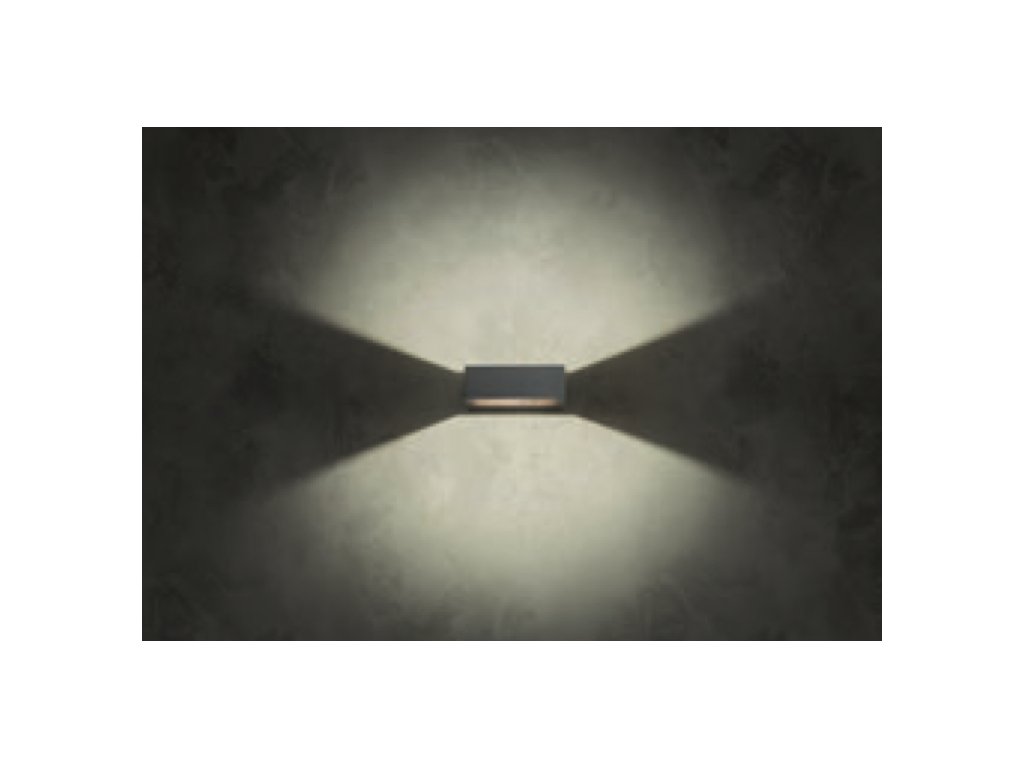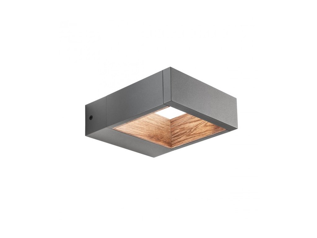 Vonkajšie nástenné svietidlo s nepriamym rozptylom svetla, vybavené COB LED. Teleso z tlakovo liateho hliníka elektrostaticky lakované tmavo šedou farbou s dekoratívnou potlačou imitácie dreva v interiéri, difúzor z číreho tvrdeného skla.