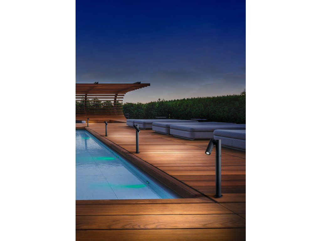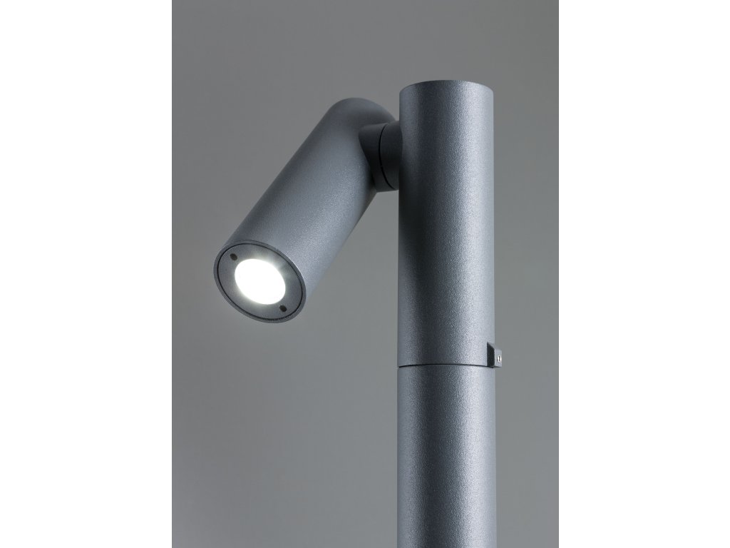 Nastaviteľný mini projektor/stĺpik pre exteriér, vybavený LED diódami, určený na montáž na podlahu, hliníkové telo elektrostaticky lakované v tmavo šedej farbe, priehľadný sklenený difúzor.