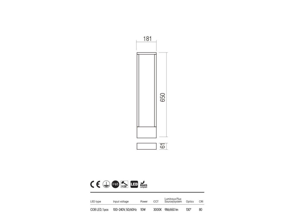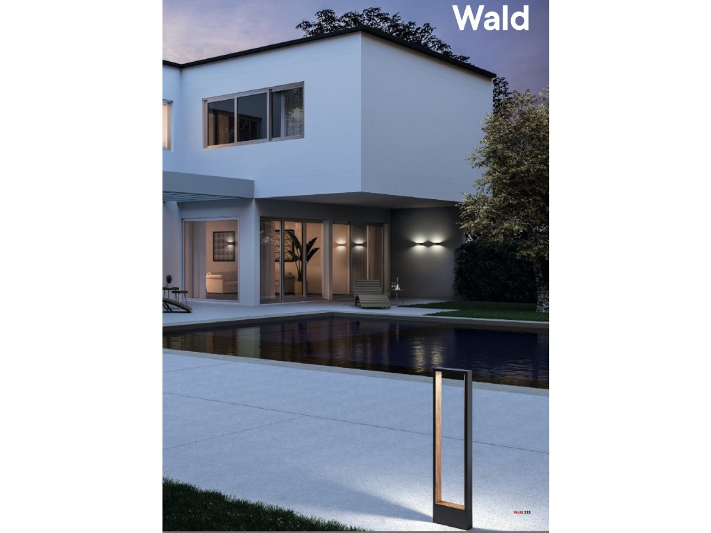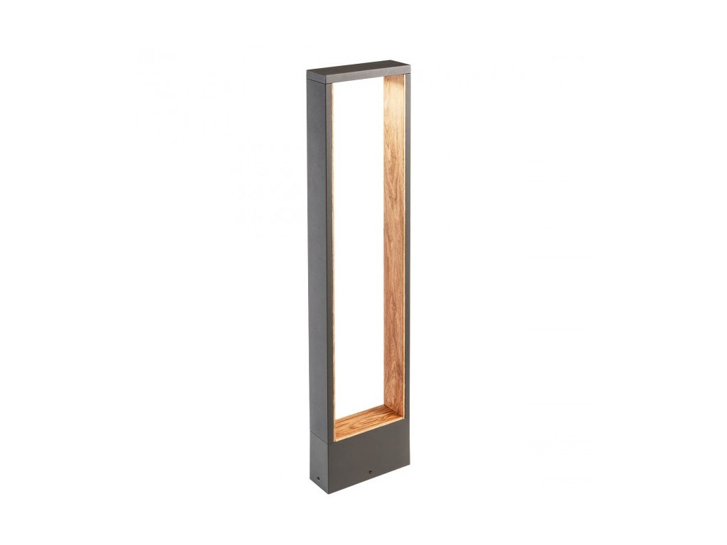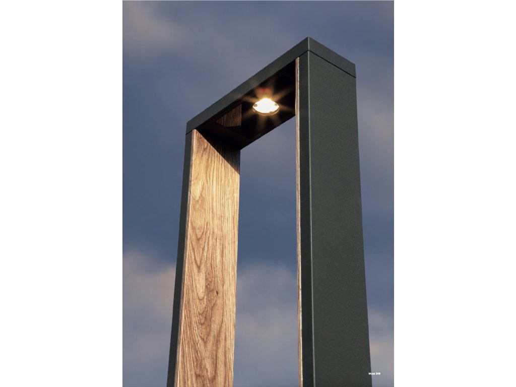 Vonkajší stĺpik s nepriamym rozložením svetla, vybavený COB LED. Teleso z tlakovo liateho hliníka elektrostaticky lakované tmavo šedou farbou s dekoratívnou potlačou imitácie dreva v interiéri, difúzor z číreho tvrdeného skla.