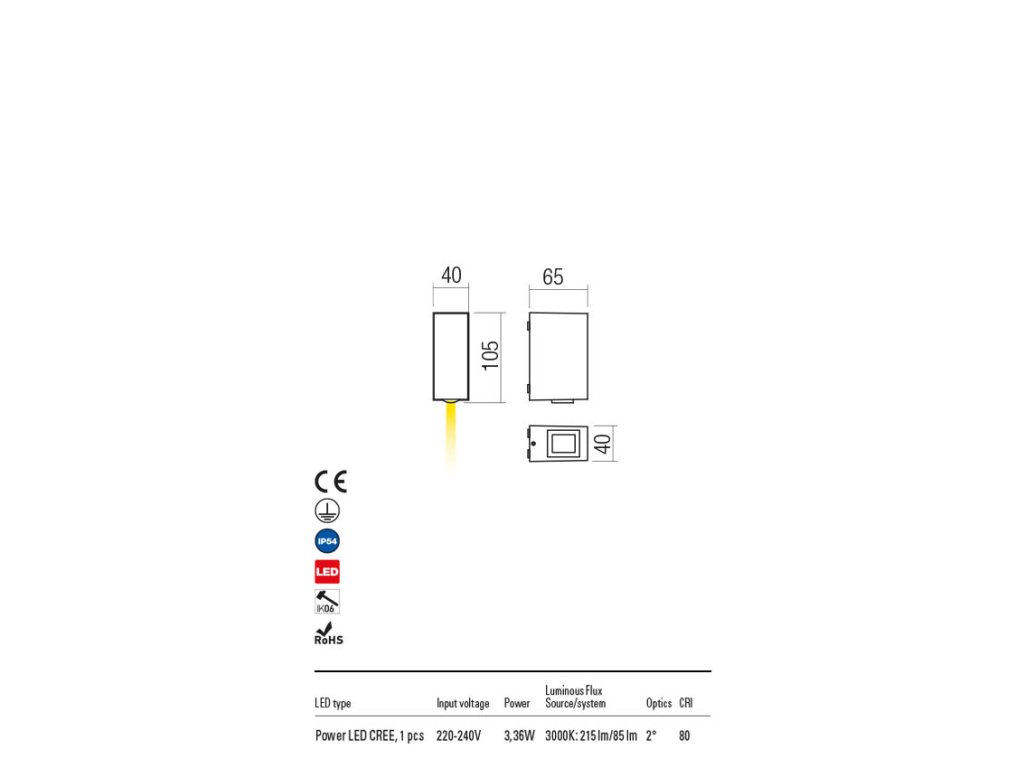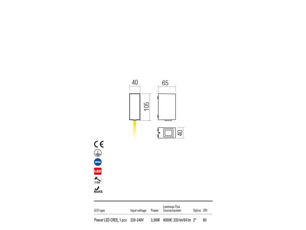 Vonkajšie nástenné svietidlo s priamym / nepriamym rozptylom svetla, vybavené LED diódou POWER. Kryt z liateho hliníka, v pieskovo bielej, tmavo šedej alebo tmavo hnedej farbe, priehľadné akyrl šošovky, integrovaný ovládač.Dodatočné parametre