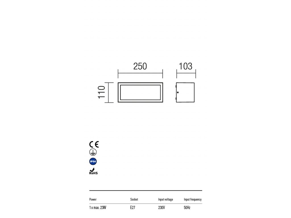 Vonkajšie nástenné svietidlo, tmavo šedá alebo hnedá hliníková zliatina, opálový polykarbonátový difúzor. Žiarovka nie je súčasťou balenia.Dodatočné parametre