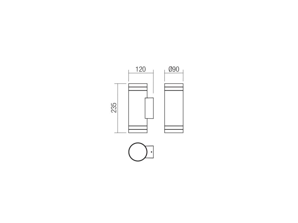 Nástenné svietidlo na vonkajšie použitie, priame/nepriame vyžarovanie svetla so svetelným efektom "wall wash". Puzdro z tlakovo liateho hliníka, elektrostaticky lakované v tmavo šedej farbe, s dvoma difúzormi: jeden dekoratívny z priehľadného polykarbonátu a druhý z priehľadného skla. Žiarovka GU10 nie je súčasťou balenia.
