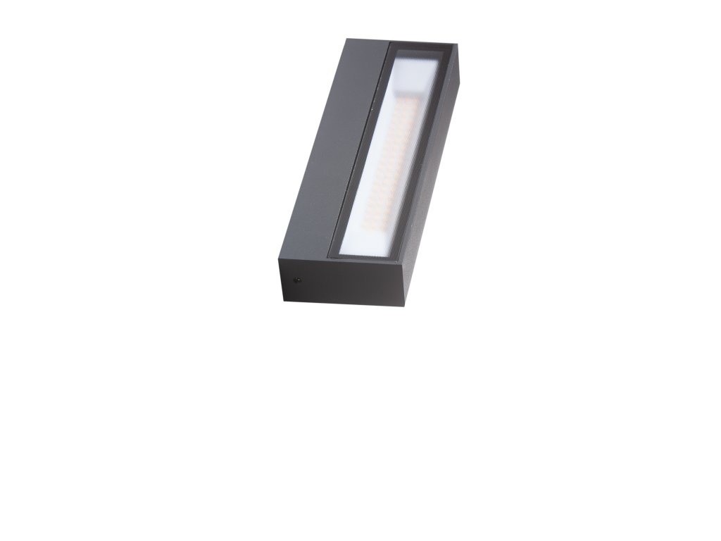 Jednoduché a dizajnové, nástenné LED fasádne svietidlo s vysokým stupňom krytia IP54, vyrobené z obdĺžnikového kovového tela tmavo šedej alebo čiernej farby s akrylátovým difúzorom. Moderné riešenie vonkajšieho osvetlenia fasády, terasy, verandy a záhrady vo vašom štýlovom dome, vile, hoteli a reštaurácii.