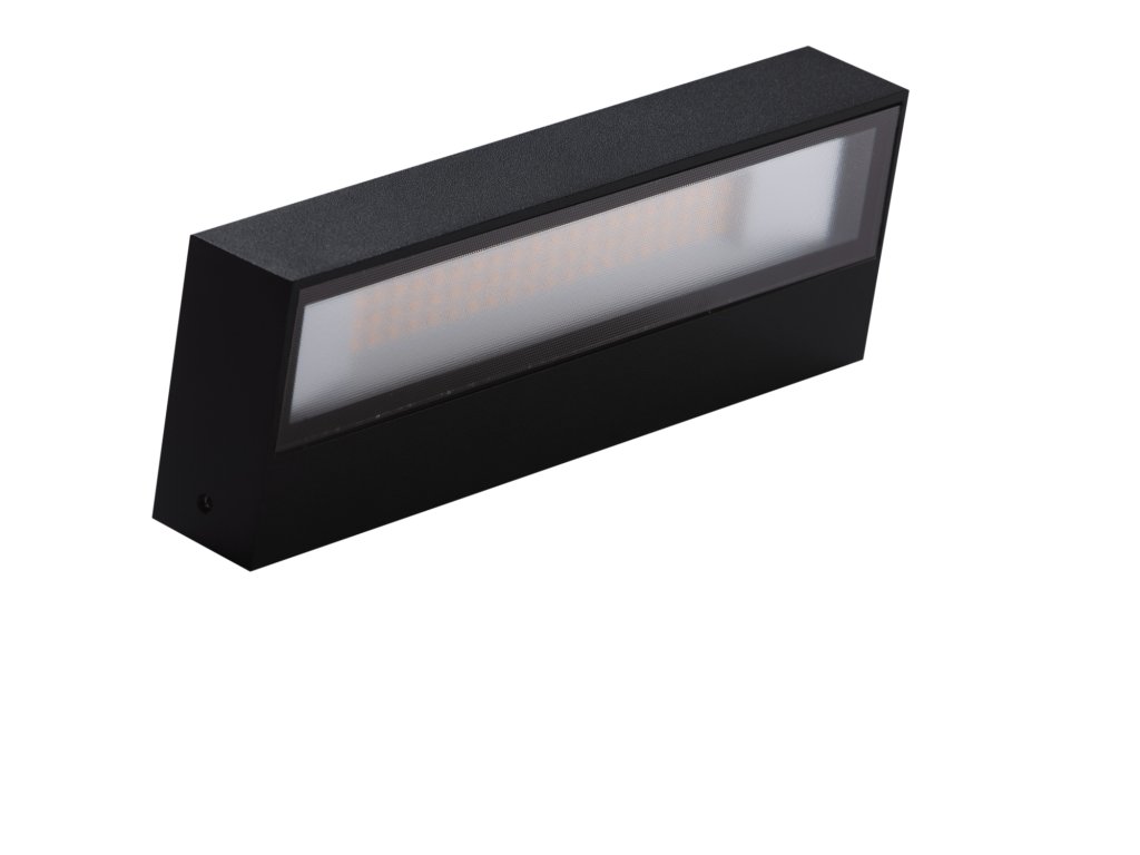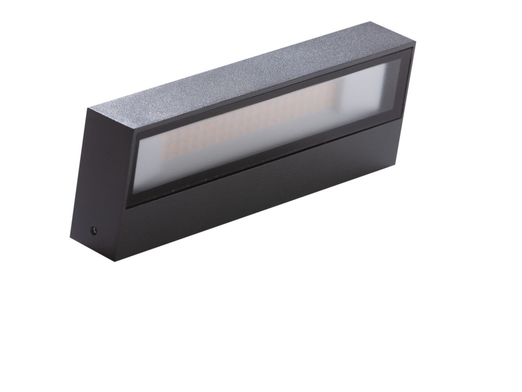 Jednoduché, dizajnové nástenné LED fasádne svietidlo s vysokým stupňom krytia IP54, vyrobené z obdĺžnikového kovového tela a akrylátového difúzora s obojsmerným rozvodom osvetlenia. reštaurácii.