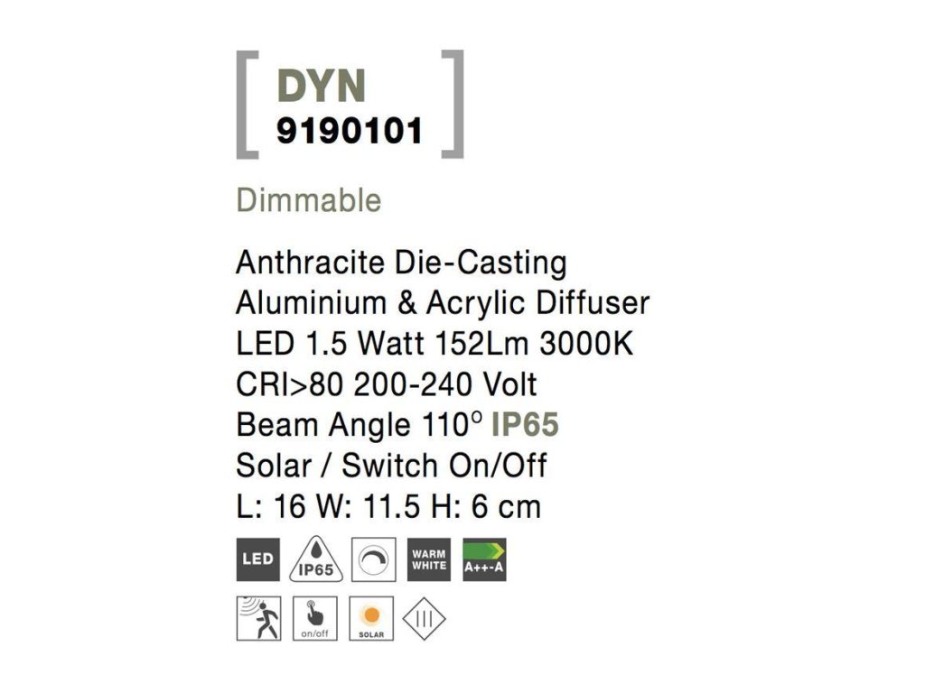 Vonkajšie nástenné svietidlo DYN, LED 1.5W 3000K 3.7V, IP65 solárne / vypínač na tele / pohybové čidlo
