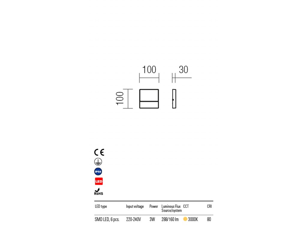 Vonkajšie nástenné svietidlo vhodné ako orientačné osvetlenie na fasádach a stenách okolo domov, chodníkov, altánkov alebo garáží. Dostatočne osvetlí plochu pod sebou a zaručí tak bezpečnosť na schodisku alebo okolo chodníka. SMD LED zdroje sú ukryté v hliníkovom tele. Sklenený kryt v plochom tele smeruje prúd svetla iba dole a neoslňuje tak okolie. Svietidlo sa montuje priamo na fasádu a nepotrebuje vlastnú inštalačnú škatuľu. LED zdroje aj transformátor sú súčasťou produktu a nedajú sa vymeniť.Dodatočné parametre