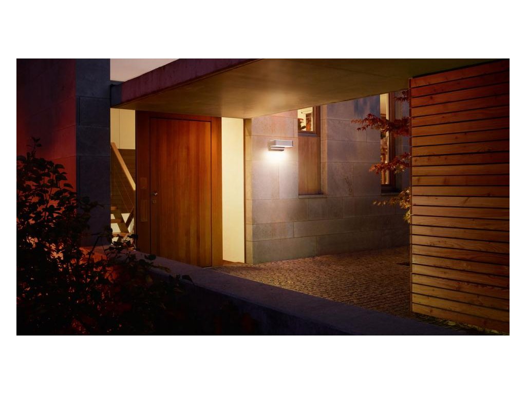 Ide o spojenie sofistikovaného dizajnu produktu a odolnej kvality materiálu v podobe vysoko kvalitného hliníka. Výsledkom je špičkový produkt na umiestnenie vonkajších stien a fasád domov v atmosférickom svetle. Teplé biele svetlo (3 000 K) s 466 lm pri iba 7,5 W zaisťuje príjemnú svetelnú náladu. Atraktívne vonkajšie svetlo je možné bleskovo prepojiť cez Bluetooth. Bezdrôtovo – a nenápadne. A preto sa veľmi ľahko integruje napríklad do senzorovo riadených svetelných sietí. Prirodzene však toto elegantné vonkajšie svetlo je možné použiť aj ako samostatné riešenie pre nádherné svetelné efekty.