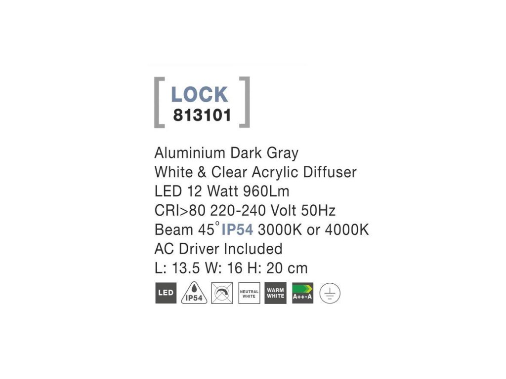 Vonkajšie nástenné svietidlo LOCK, LED 12W 45st. IP54 3000K alebo 4000K