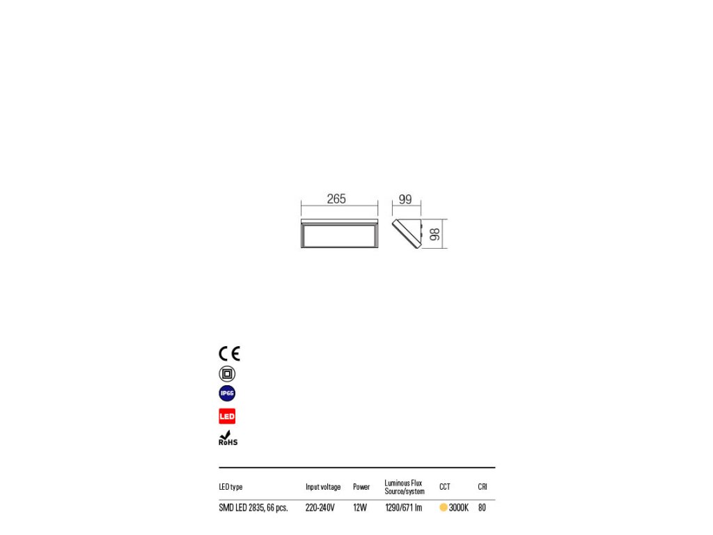 Vonkajšie nástenné svietidlo s priamym rozptylom svetla v tmavo šedej farbe s priehľadným polykarbonátovým difúzorom, pod ktorými je zabudovaný LED zdroj s farbou svetla 3000K. Exteriérové vonkajšie svietidlo Mako má ochranné krytie IP65, napájanie 220-240V, CRI80.Dodatočné parametre