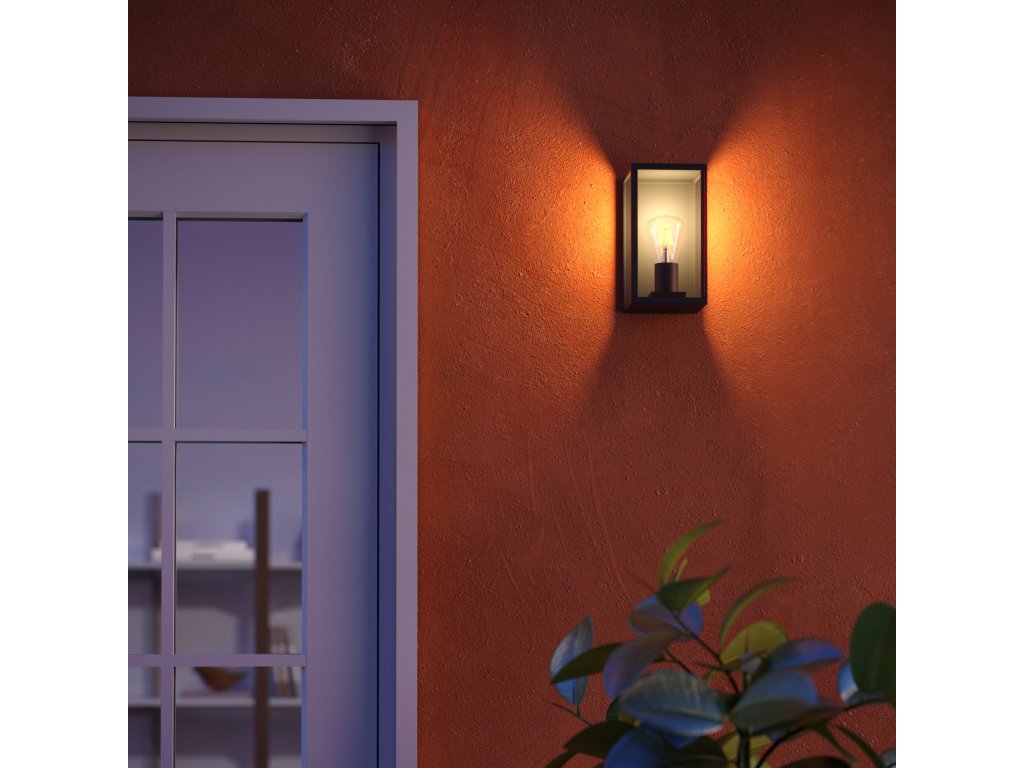 Vonkajšie nástenné svietidlo, telo z tlakovo liateho hliníka, elektrostaticky lakované v matnej čiernej farbe, priehľadné sklenené difúzory. Žiarovka E27 nie je súčasťou balenia.
