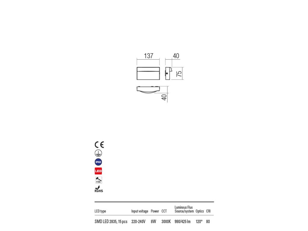 Vonkajšie nástenné svietidlo má telo z hliníkového odliatku, ktorý je lakovaný v pieskovej bielej, šedej alebo hnedej farbe a priehľadný polykarbonátový difúzor. Vo svietidle je zabudovaný LED zdroj s farbou svetla 3000K. Vonkajšie svietidlo POLIFEMO má ochranné krytie IP65, CRI80 a svetlo vyžaruje v uhle 120 °.Dodatočné parametre