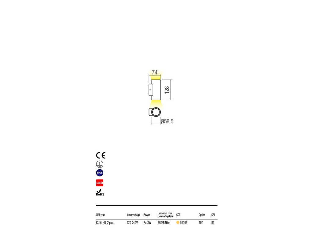Vonkajšie nástenné svietidlo vybavené LED diódami COB s hliníkovou konštrukciou. Osvetlenie svieti smerom dole na stenu, stane sa tak krásnou vonkajšou dekoráciou.Dodatočné parametre