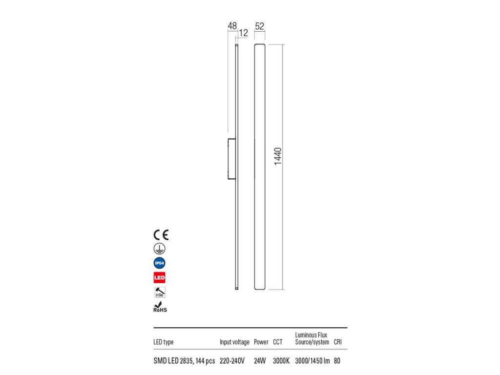 Vonkajšie nástenné svietidlo má telo z liateho hliníka elektrostaticky lakovaného v tmavo šedej alebo matnej bielej farbe a saténový polykarbonátový difúzor, pod ktorým je zabudovaný 1 LED zdroj s farbou svetla 3000K. Svietidlo je možné umiestniť vertikálne aj horizontálne a vytvoriť tak veľmi pútavý prvok vašej fasády alebo terasy. Vonkajšie svietidlo REFLEXA má ochranné krytie IP54, ktoré zaisťuje ochranu pred prachom a vodou z akéhokoľvek smeru. Svietidlo REFLEXA je dostupné v dvoch šírkach - 124 a 144cm, napájanie 220-240V, CRI80.Dodatočné parametre