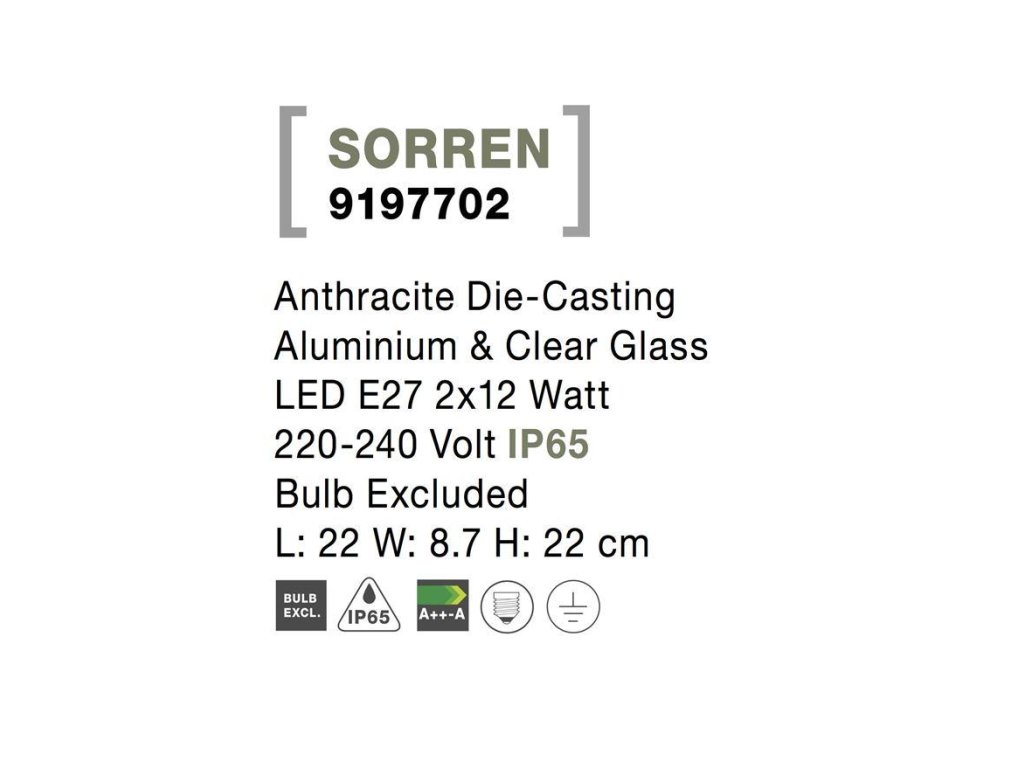 Vonkajšie nástenné svietidlo SORREN, E27 2x12W IP65