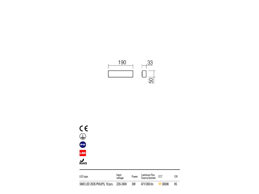 Nástenné vonkajšie svietidlo s priamym osvetlením, vybavené SMD LED diódami. Hliníková konštrukcia lakovaná v matne bielej alebo čiernej, polykarbonatový saténový difúzor.Dodatočné parametre