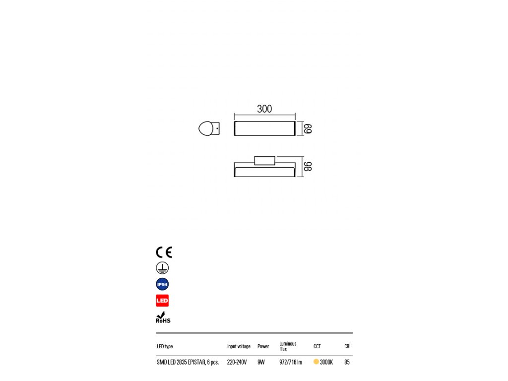 Vonkajšie nástenné svietidlo vybavené SMD LED s hliníkovou konštrukciou a opálovým polykarbonátovým difúzerom. Svietidlo má IP54.Dodatočné parametre