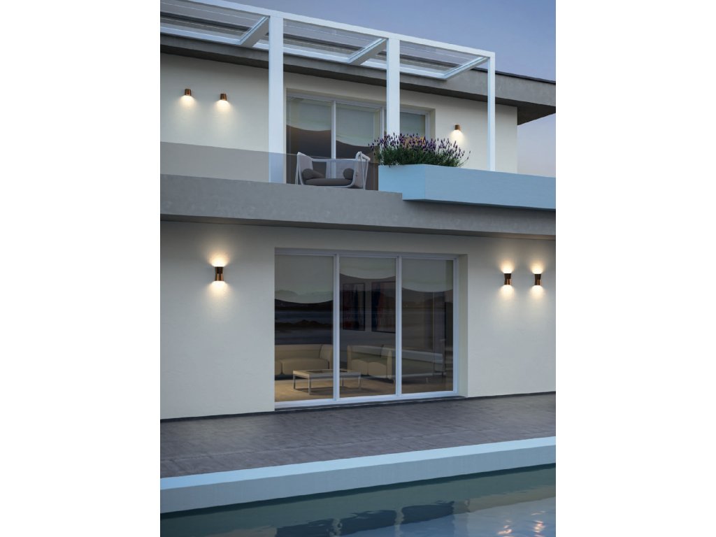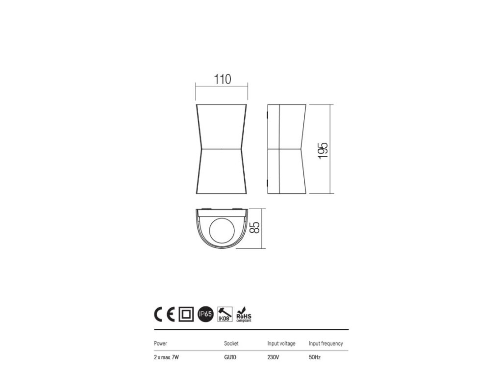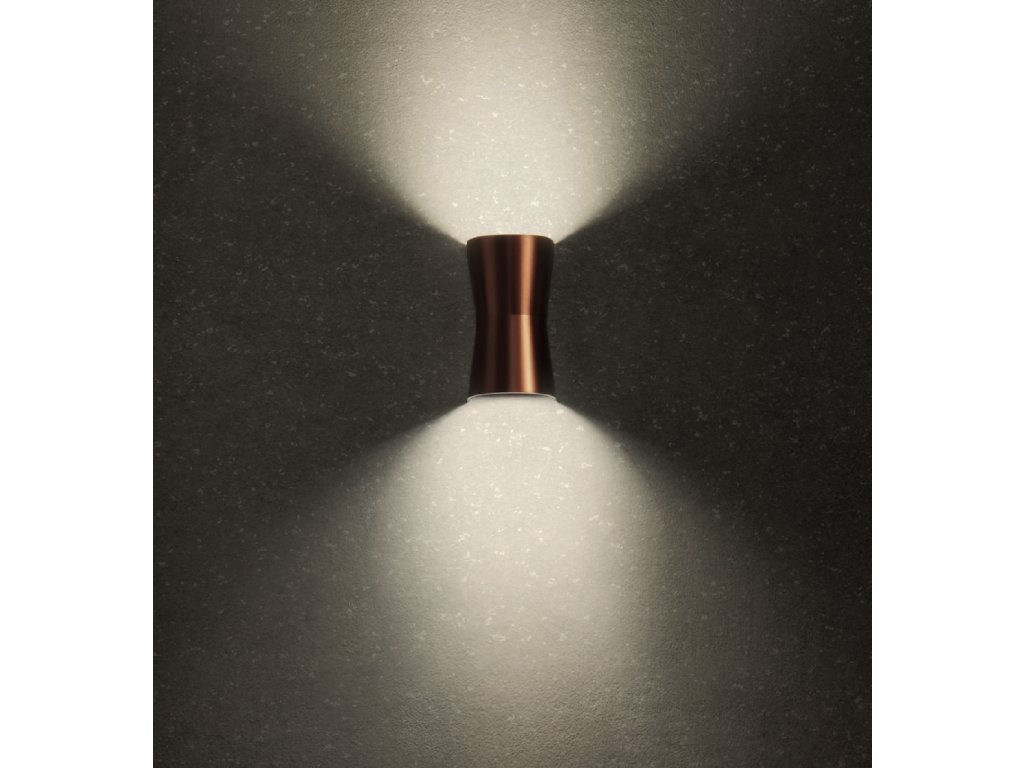 Vonkajšie nástenné svietidlo s priamym/nepriamym vyžarovaním svetla. Štruktúra z polykarbonátu a tmavo šedého ABS alebo ABS s medenou povrchovou úpravou, priehľadný polykarbonátový difúzor. Žiarovka nie je súčasťou balenia.