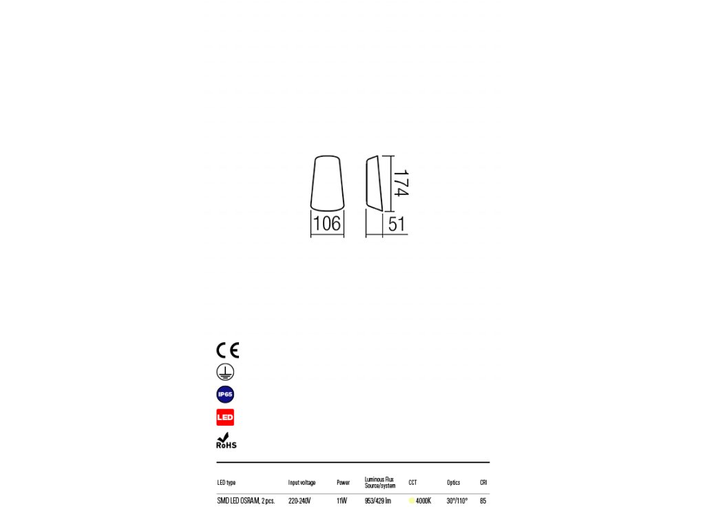 Nástenné vonkajšie svietidlo vybavené LED diódami, s priamym / nepriamym osvetlením s efektom nástenného osvetlenia. Lakovaná hliníková konštrukcia a priehľadným skleneným difúzorom.Dodatočné parametre