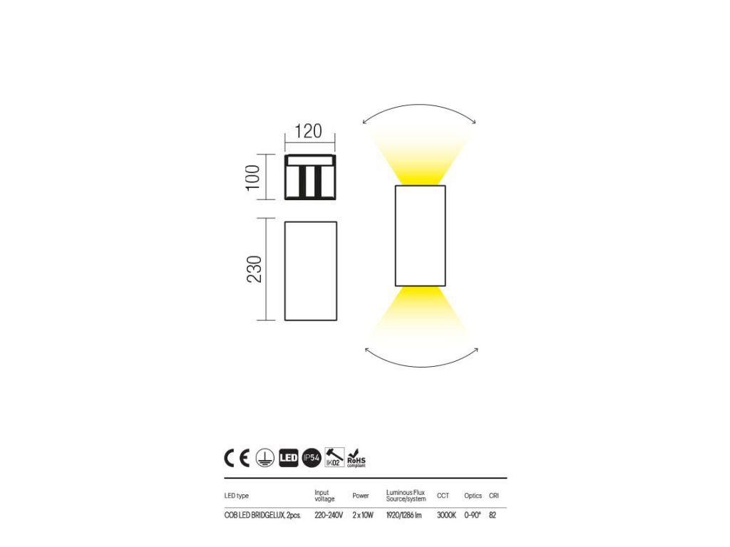Vonkajšie nástenné svietidlo v modernom hranatom tvare v niekoľkých prevedeniach. Tento produkt z hliníkovej zliatiny je vhodný pre nepriame osvetlenie na fasády súkromných aj komerčných rezidencií. Iste bude nielen úsporným zdrojom svetla, ale aj štýlovou a zaujímavou ozdobou na stenách budov aj v interiéri. Vo svietidle je možné dvoma výklopnými plôškami regulovať vyžarovací uhol svetla dole aj hore. Integrované LED zdroje vydávajú jemné svetlo. LED zdroje COB a transformátor sú súčasťou výrobku sa nedajú vymeniť.Dodatočné parametre