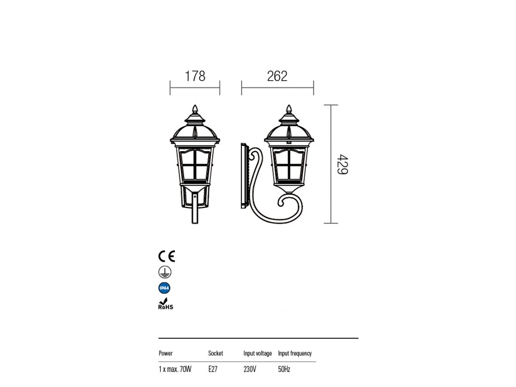 Vonkajšie nástenné svietidlo zaistí osvetlenie v okolí domu, garáže alebo altánku a zaisťuje bezpečnosť a pohodlie. Toto moderné poňatie rustikálnej lucerny je nielen zdrojom svetla, ale aj štýlovou výzdobou fasády. Hliníková zliatina antickej čiernej s hnedou patinou, číry sklenený difúzor typu "vodné sklo". Vďaka číremu sklu, ktoré dotvára očarujúce vzhľad svietidla, je vidieť svetelný zdroj. K tomuto svietidlu odporúčame LED žiarovky s päticou E27, ktorá nie je súčasťou prDodatočné parametre