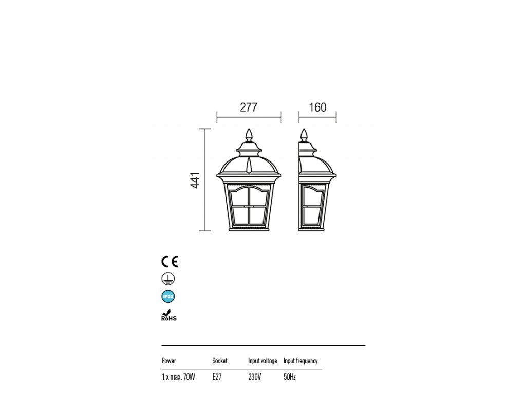 Vonkajšie nástenné svietidlo zaistí osvetlenie v okolí domu, garáže alebo altánku a zaisťuje bezpečnosť a pohodlie. Toto moderné poňatie rustikálnej lucerny je nielen zdrojom svetla, ale aj štýlovou výzdobou fasády. Hliníková zliatina antickej čiernej s hnedou patinou, číry sklenený difúzor typu "vodné sklo". Vďaka číremu sklu, ktoré dotvára očarujúce vzhľad svietidla, je vidieť svetelný zdroj. K tomuto svietidlu odporúčame LED žiarovky s päticou E27, ktorá nie je súčasťou prDodatočné parametre