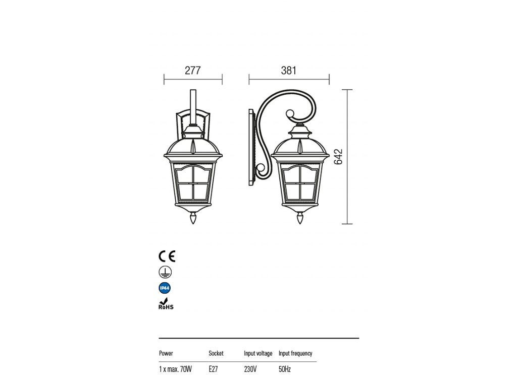 Vonkajšie nástenné svietidlo zaistí osvetlenie v okolí domu, garáže alebo altánku a zaisťuje bezpečnosť a pohodlie. Toto moderné poňatie rustikálnej lucerny je nielen zdrojom svetla, ale aj štýlovou výzdobou fasády. Hliníková zliatina antickej čiernej s hnedou patinou, číry sklenený difúzor typu "vodné sklo". Vďaka číremu sklu, ktoré dotvára očarujúce vzhľad svietidla, je vidieť svetelný zdroj. K tomuto svietidlu odporúčame LED žiarovky s päticou E27, ktorá nie je súčasťou prDodatočné parametre