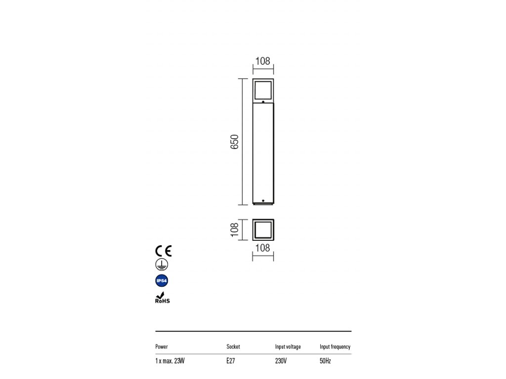 Vonkajšia stĺpiková lampa, hliníková zliatina hrdzavo hnedej farby alebo antracitovej, saténový polykarbonátový difúzor. Žiarovka nie je súčasťou balenia.Dodatočné parametre