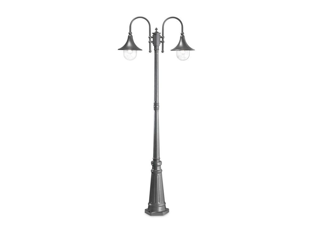 Stĺpové svietidlo Cima PT2 z kolekcie vonkajšieho osvetlenia Ideal Lux v klasickom prevedení s celkovou výškou 216 cm so zvonovitým tvarom difúzorov s priemerom 25 cm je typickým osvetlením pre mestské parky a zelene. Bytelná základňa má priemer 23 cm. Svietidlo je vyrobené z liateho hliníka s povrchovou úpravou antickej čiernej, teda čierny podklad so zlatou patinou. Dve oblúkovité ramená sú umiestnené v hornej časti oboch difúzorov, ktoré sú doplnené o číre akrylové kryty a osadené päticou E27 s maximálnym príkonom 2 x 60W. Zdroje nie sú súčasťou balenia, odporúčame zvoliť LED filamentové žiarovky, ktoré podčiarknu vzhľad celého svietidla. Krytie IP43 je vhodné na montáž do exteriéru.Dodatočné parametre