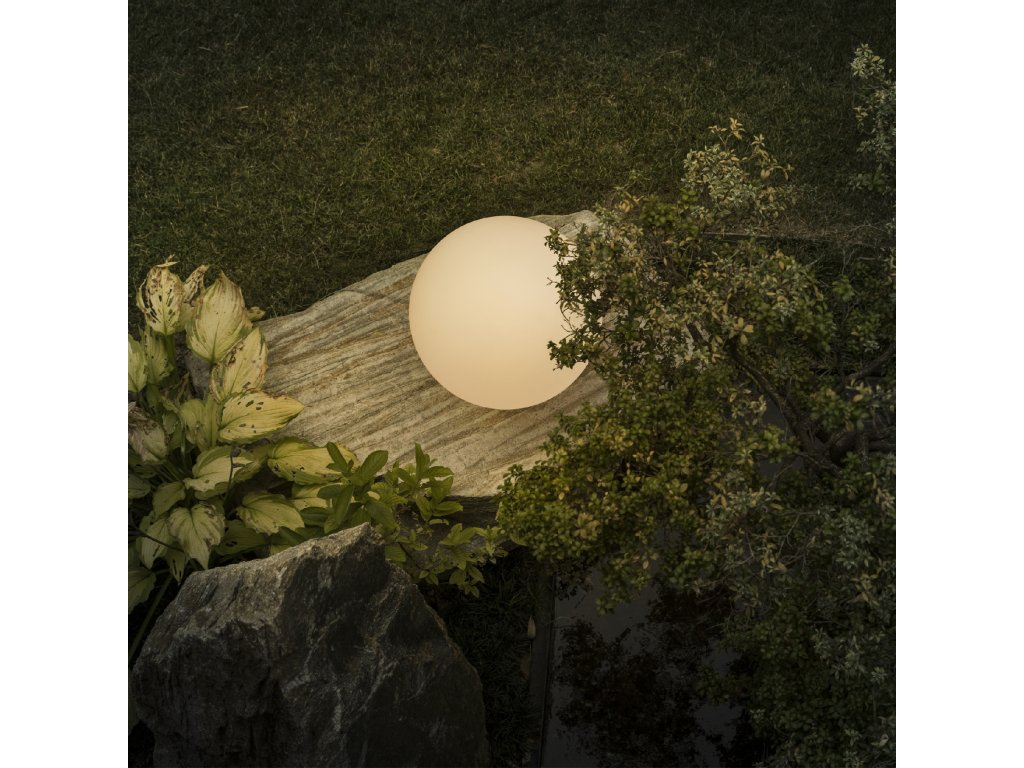 Veľké okrúhle záhradné svietidlo s priemerom 50 cm ozdobí záhradu alebo terasu a spríjemní pobyt vonku. Plastové matne biele tienidlo príjemne rozptyľuje svetlo. Základňu s priemerom 18,5 cm je možné pripevniť k zemi pomocou príslušenstva dodávaného v balení. Prívodný čierny kábel s dĺžkou 2,8 m s vidlicou do zásuvky je taktiež súčasťou dodávky. Vnútri je lampa osadená päticou E27 pre žiarovku s maximálnym príkonom 1 x 60 W, ktorá nie je dodávaná so svietidlom. Pre úsporu el. energie odporúčame použitie úspornej LED žiarovky. Krytie IP44 označuje vhodnosť použitia vo vlhkom vonkajšom prostredí.Dodatočné parametre