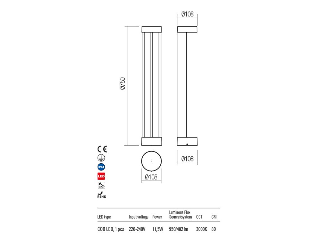 Vonkajšie záhradné stĺpikové svietidlo s COB LED. Konštrukcia svietidla je z liateho hliníka, lakovaná v tmavo šedej alebo tmavo hnedej farbe s priehľadným difúzorom z tvrdeného skla.Dodatočné parametre