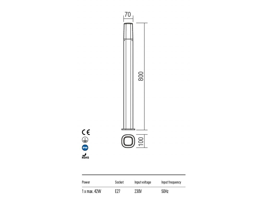 Vonkajšie stĺpikové svietidlo vyrobené z hliníkovej zliatiny s bielym opálovým polykarbonátovým difuzérom. Žiarovka nie je súčasťou balenia.Dodatočné parametre