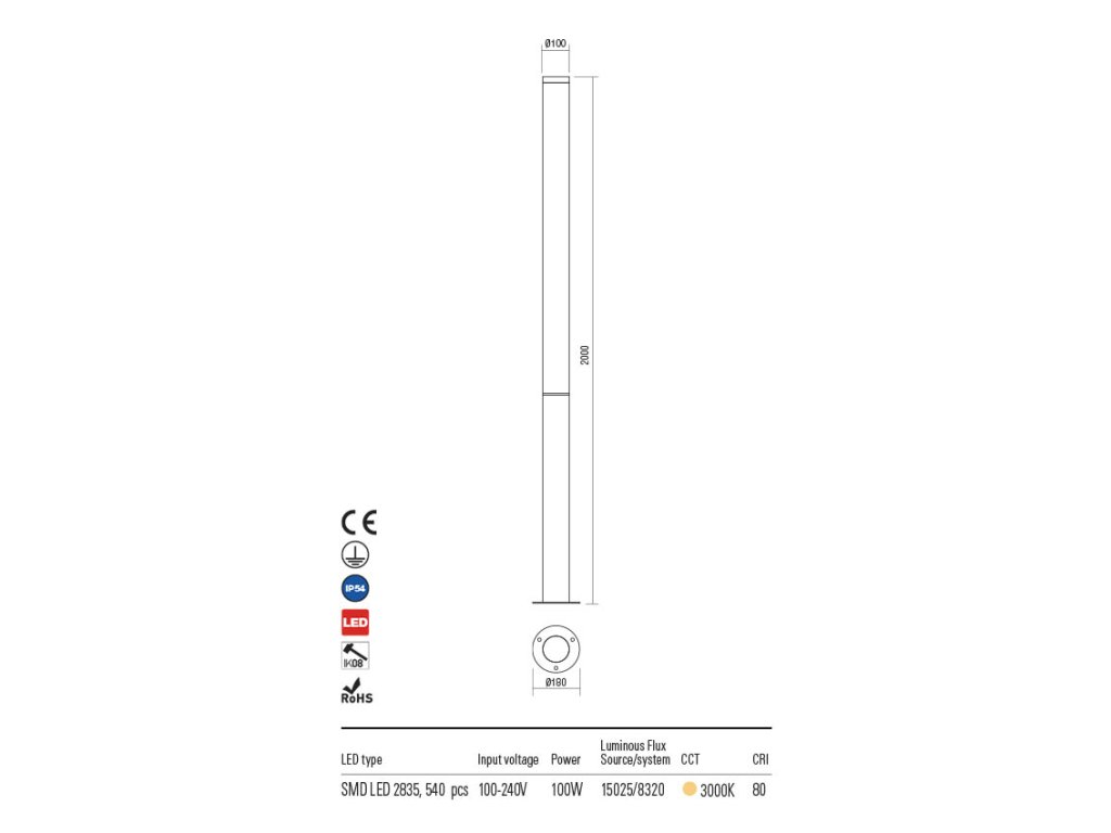 Vonkajšie stĺpikové svietidlo je vhodné k chodníkom a komunikáciám komerčných i súkromných rezidencií. Stĺpik na vonkajšie použitie vybavený LED diódami SMD a integrovaným predradníkom. Telo z tlakovo liateho hliníka lakované tmavo šedou farbou, opálový polykarbonátový difúzor.Dodatočné parametre