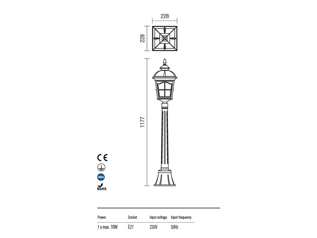 Vonkajšie stĺpikové svietidlo zaistí osvetlenie v okolí domu, garáže alebo altánku a zaisťuje bezpečnosť a pohodlie. Toto moderné poňatie rustikálnej lucerny je nielen zdrojom svetla, ale aj štýlovou výzdobou fasády. Hliníková zliatina antickej čiernej s hnedou patinou, číry sklenený difúzor typu "vodné sklo". Vďaka číremu sklu, ktoré dotvára očarujúce vzhľad svietidla, je vidieť svetelný zdroj. K tomuto svietidlu odporúčame LED žiarovky s päticou E27, ktorá nie je súčasťou prDodatočné parametre
