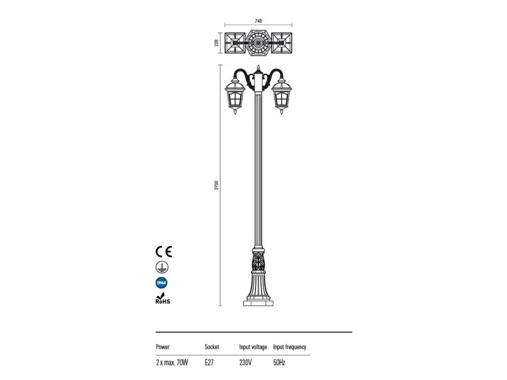 Vonkajšie stĺpikové svietidlo zaistí osvetlenie v okolí domu, garáže alebo altánku a zaisťuje bezpečnosť a pohodlie. Toto moderné poňatie rustikálnej lucerny je nielen zdrojom svetla, ale aj štýlovou výzdobou fasády. Hliníková zliatina antickej čiernej s hnedou patinou, číry sklenený difúzor typu "vodné sklo". Vďaka číremu sklu, ktoré dotvára očarujúce vzhľad svietidla, je vidieť svetelný zdroj. K tomuto svietidlu odporúčame LED žiarovky s päticou E27, ktorá nie je súčasťou prDodatočné parametre
