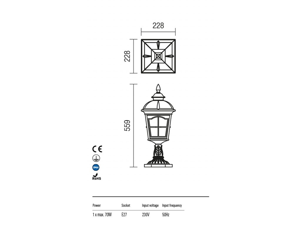 Vonkajšie stĺpikové svietidlo zaistí osvetlenie v okolí domu, garáže alebo altánku a zaisťuje bezpečnosť a pohodlie. Toto moderné poňatie rustikálnej lucerny je nielen zdrojom svetla, ale aj štýlovou výzdobou fasády. Hliníková zliatina antickej čiernej s hnedou patinou, číry sklenený difúzor typu "vodné sklo". Vďaka číremu sklu, ktoré dotvára očarujúce vzhľad svietidla, je vidieť svetelný zdroj. K tomuto svietidlu odporúčame LED žiarovky s päticou E27, ktorá nie je súčasťou prDodatočné parametre