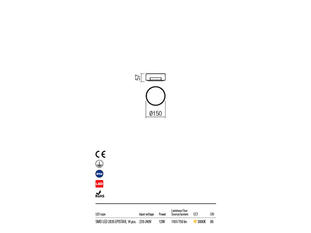 Vonkajšie nástenné alebo stropné svietidlo vybavené LED diódami v hliníkovom puzdre s polykarbonátovým difúzorom.Dodatočné parametre