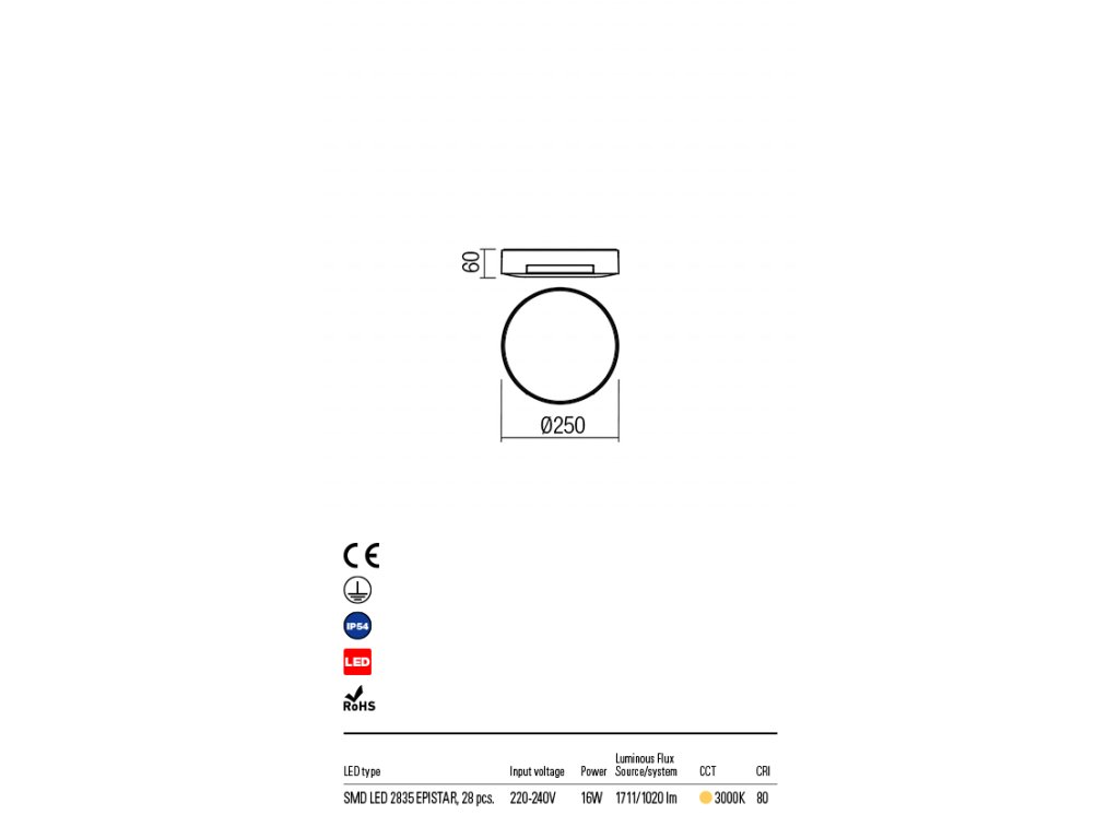 Vonkajšie nástenné alebo stropné svietidlo vybavené LED diódami v hliníkovom puzdre s polykarbonátovým difúzorom.Dodatočné parametre