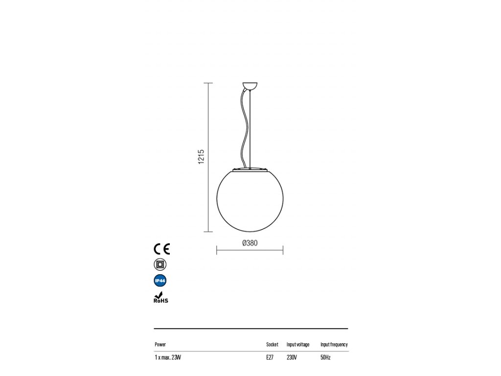 Vonkajšie závesné svietidlo, biela kovová rukoväť, okrúhly biely polyetylén odolný voči UV žiareniu. Žiarovka nie je súčasťou balenia.Dodatočné parametre