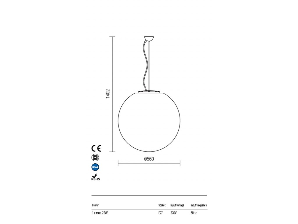 Vonkajšie závesné svietidlo, biela kovová rukoväť, okrúhly biely polyetylén odolný voči UV žiareniu. Žiarovka nie je súčasťou balenia.Dodatočné parametre