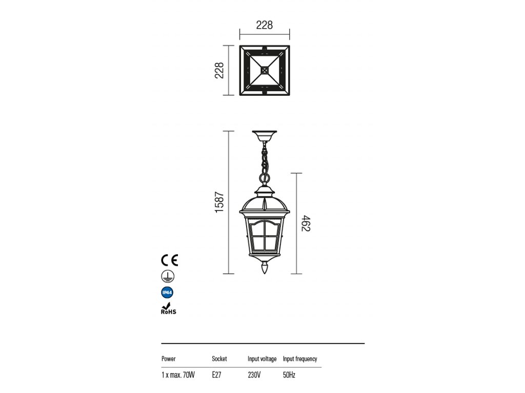 Vonkajšie závesné svietidlo zaistí osvetlenie v okolí domu, garáže alebo altánku a zaisťuje bezpečnosť a pohodlie. Toto moderné poňatie rustikálnej lucerny je nielen zdrojom svetla, ale aj štýlovou výzdobou fasády. svietidlá, je vidieť svetelný zdroj. K tomuto svietidlu odporúčame LED žiarovky s päticou E27, ktorá nie je súčasťou prDodatočné parametre