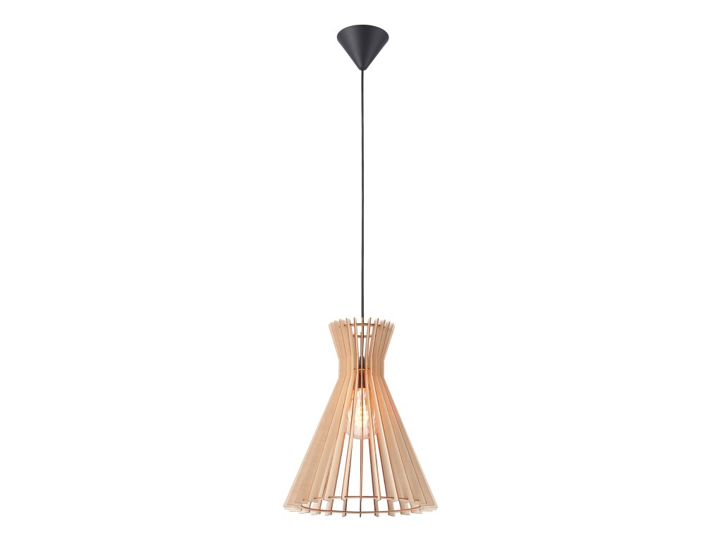 Originálna lamelová závesná lampa Nordlux Groa 34 z drevených lamiel, v prírodnej hnedej farbe či farbenej čiernej. Vyberte si ideálnu dizajnovú žiarovku na podčiarknutie dojmu.Dodatočné parametre