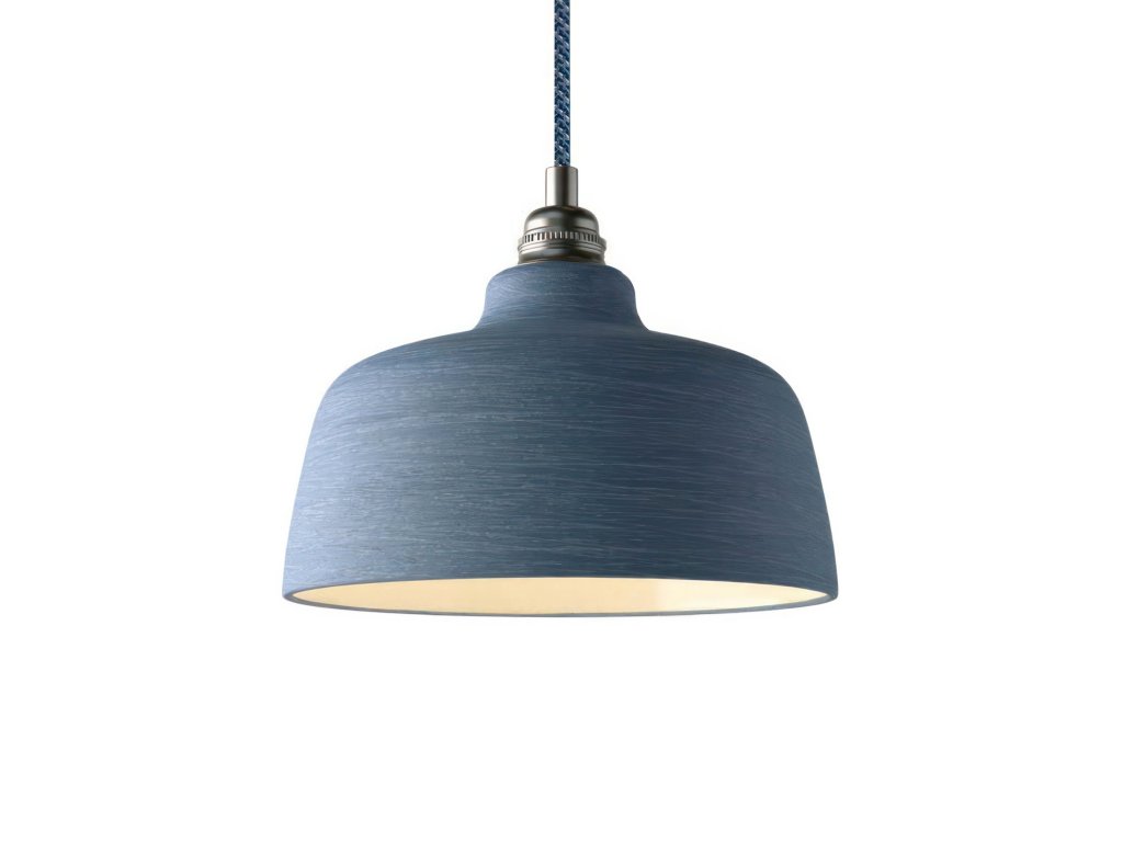 Závesná lampa s textilným káblom, keramickým tienidlom tvaru misky s kovovými detailmi
