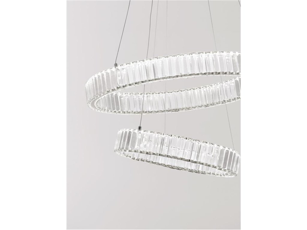 Jednoduchý dizajn dvoch strieborných, kovových kruhov - 60cm a 40cm - vysadených masívnymi krištáľovými hranolčekmi v kombinácii so striebornou rozetou prepožičiavajú svietidlu nádych klasickej elegancie a robia z neho ideálny doplnok do akéhokoľvek prostredia.