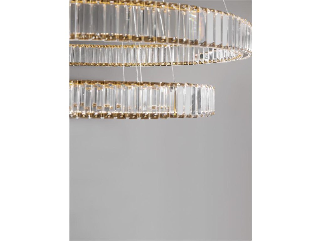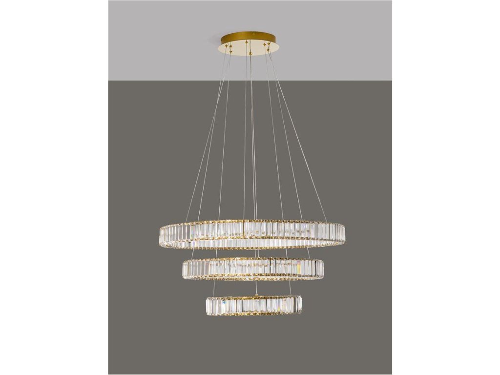 Jednoduchý dizajn troch zlatých, kovových kruhov - ø 80cm ø 60cm a 40cm - vysadených masívnymi krištáľovými hranolčekmi v kombinácii so zlatou rozetou prepožičiavajú svietidlu nádych klasickej elegancie a robia z neho ideálny doplnok do akéhokoľvek prostredia.